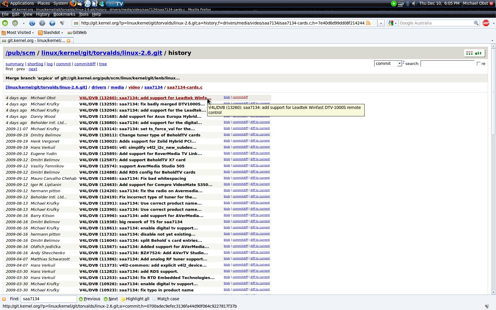 Graduation17/12/2009 7:18amOn the 15th of December, after four years of study I finally graduated. Bachelor of Science (Chemistry) and a Bachelor of Teaching (Secondary). After 90 min of traditional ceremony Nevin, Ivy, Nick, Matt and I were the last ones of the night to get our degrees. The hoods we wore were two shades of green - Malachite for education and Olivine for science. ![]() ![]() ![]() Nerd Stuff10/12/2009 7:00amSo today something very cool happenned. A while ago I wrote a patch to add support for the remote control for my tv card in linux. Today I noticed that the patch had been included in the mainline kernel by Mr. Linus Torvalds himself. A screenshot is included below. To find it yourself go to kernel.org. click mainline gitweb, drivers, media, video, saa7134, saa7134-cards.c history and then commitdiff to see my patch. Not very exciting but I think it's cool that I've now contributed to open source and linux and anyone in the world with a dtv-1000s will now be able to use the remote control in mythtv etc...